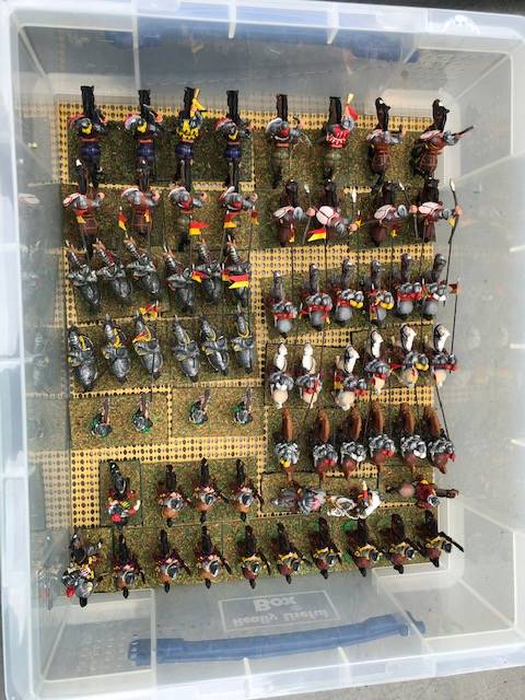 All that is, except one era... my Renaissance troops. The explanation for this is pretty simple. Most troops of this era are fairly generic. That's a plus with regard to collecting and painting them, but a detriment when it comes to counting and documenting them. The recent "Off the Shelf" reorganization of my collection created an opportunity to assign the figures to semi permanent boxes for the long haul, and in so doing to finally complete their census (now if only they could be taxed to pay for their upkeep and support!).